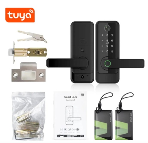 La cerradura V1 Pro Tuya Smart WiFi es un sistema de seguridad inteligente con cámara HD 1080p integrada, que permite gestionar el acceso a través de la app Tuya Smart/Smart Life. Ofrece 5 métodos de apertura (huella, clave, tarjeta, app y llave) y cuenta con alertas en tiempo real, mirilla electrónica y diseño para puertas de madera/metal que tenga un grosor entre 3,5 a 6cm.